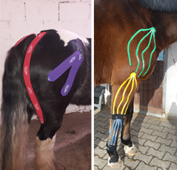 Das Kinesiologische Tape unterstützt meine tierphysiotherapeutischen Behandlungen. Durch das Anheben des Fells schafft es Platz im darunter liegenden Gewebe und Muskulatur. Es kommt zur verbesserten Durchblutung, Schmerzlinderung, Lymphabfluss und einer besseren Muskelaktivität.