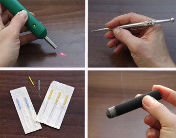 Mein Handwerkszeug für die Tierakupunktur. Laser, Akupressur-Stift, Nadeln und Moxa-Zigarre.